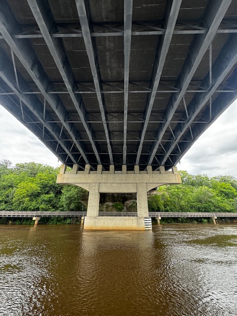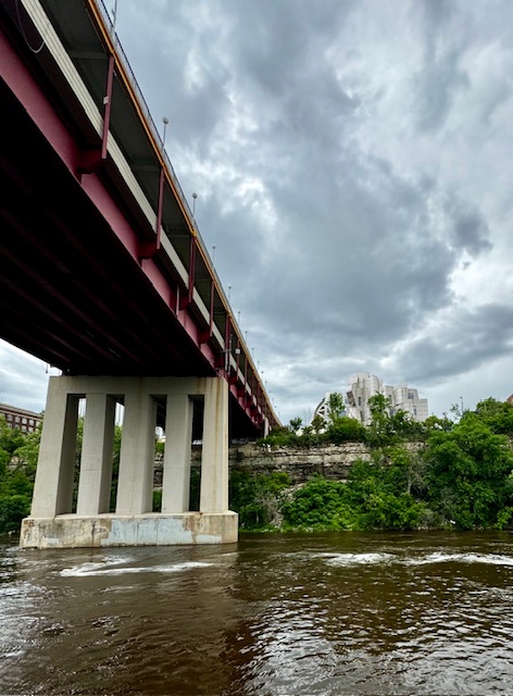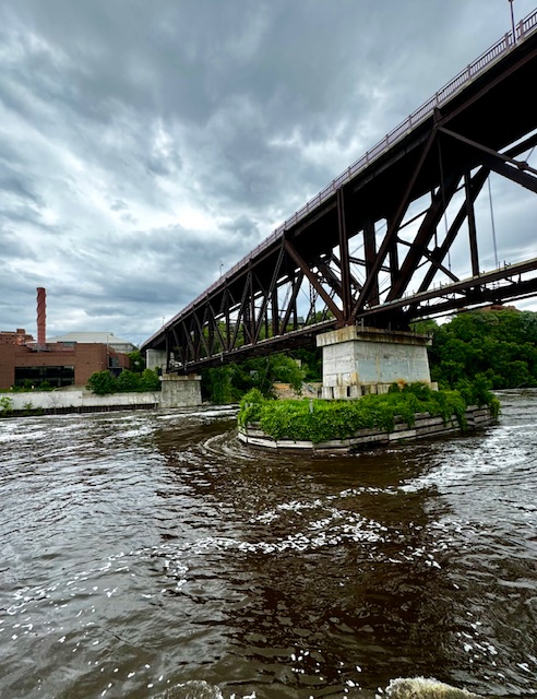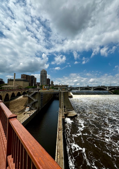 After the Haring exhibition we boarded a tourist boat on the Mississippi. This was pretty interesting. The initial journey is upstream through the the lower St. Anthony Falls Lock system. The Upper St Anthony Falls lock is now closed to keep invasive carp from penetrating further up the Mississippi system.
