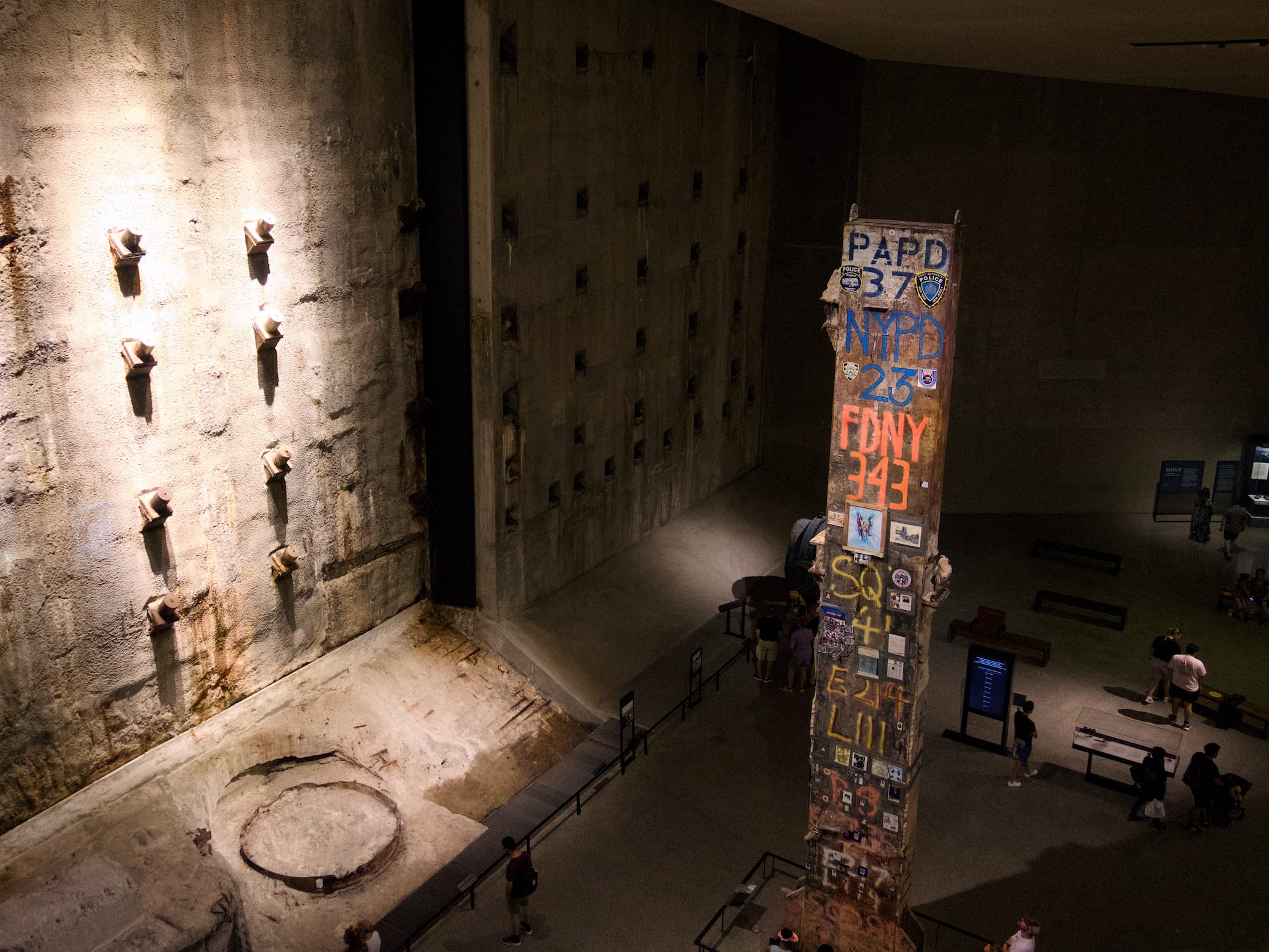 (https://www.911memorial.org/connect/blog/slurry-wall-behind-engineering-feat-made-wtc-possible) On the left and a steel support column on the right with the names of the lost colleagues of the police and fire stations departments.