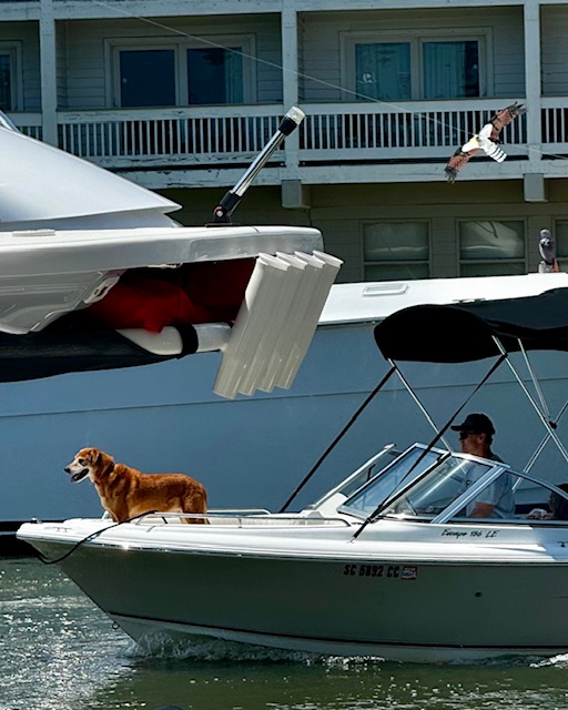 The restaurant is on Shem Creek, one of Charleston myriad estuaries, creeks and rivers and is full of canoes and motor boats carrying happy people and dogs.