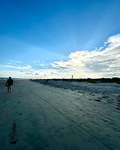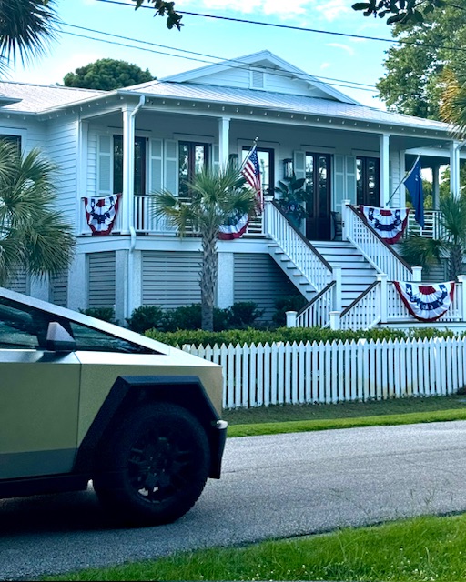 Sullivan's Island was less busy and we found parking near one of the expansive South Carolina beaches. To get to the beach one walks along a lovely boardwalk just above the vegetated foredune. The beach itself is wide, shallow and seems to go on forever and the sand is fine like sugar. Full of families and young people having a good time. The homes (some palatial), are decked out in preparation for the 4th July. My photo was also photobombed, this time by a Cybertruck!