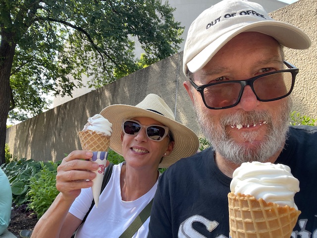 By this time the heat had really got to us. So it was ice-cream time. There are many many (perhaps even "scores") of these trucks parked near every tourist site. They seem to be run by mid-eastern men who are sharp enough to get away with charging $10.00 a cone. I finished mine. Karen wasn't able to eat (lick) quickly enough before her cone was all over her hands, the napkin and, necessarily, in the bin.